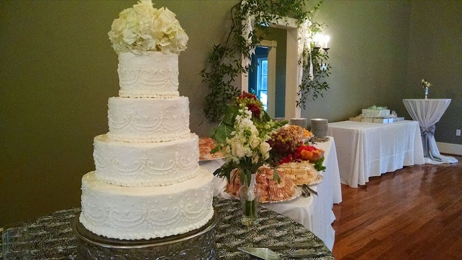 The bride’s cake was elegant with a lot of delegate trim work.