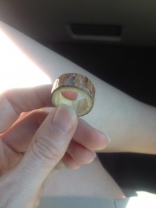 He sawed off a piece of a limb, hollowed it out til it fit and then used 4 coats of clear nail polish to make it shiny.
