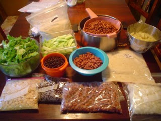 Lettuce washed for salad; beans for eating for a few days and some packaged/frozen for next week; onions chopped; potatoes cooked for potato salad; celery cleaned/cut and rice.