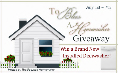Eligibility rules: The dishwasher will be chosen by To Bless A Homemaker Giveaways and may not be the exact model pictured above. Winner can choose between black or white in color. Void where prohibited by law. In no way is this giveaway sponsored, endorsed, or associated by Facebook. By entering this giveaway, you agree to release Facebook, To Bless a Homemaker Giveaways Ministry, and all participating blogs of all liability. Organized by: The Focused Homemaker in conjunction with To Bless A Homemaker Giveaways. Contest ends at 12:00 am Central Time on Sunday, July 7, 2013. Winner randomly chosen by Rafflecopter and notified by email on July 8, 2013. Open to US residents, ages 18+. To enter please use the Rafflecopter form below.