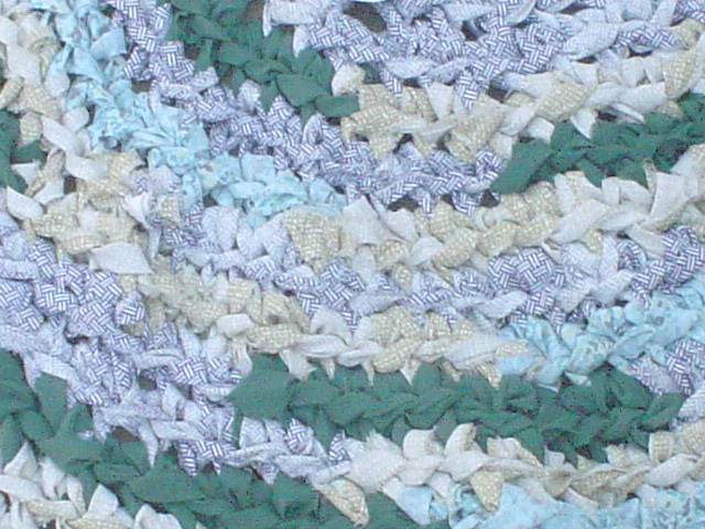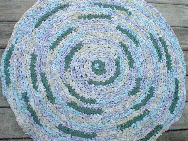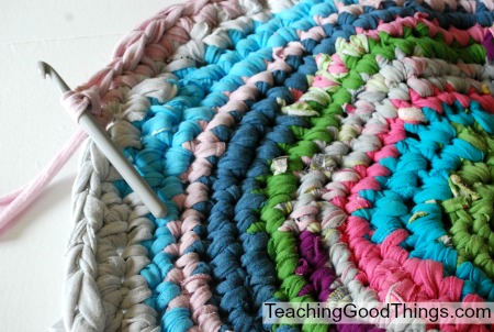 I cut her neglected clothing into 1″ (ish) strips, connected them with slip knots (shown below) and made this sweeeet rag rug in about 4-5 hours total.