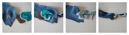 Take each strip and cut a small slit in each end and then pull one through the other, this will keep you from having a lot of ends popping up here and there. I do this as I crochet so I can pick my next color as I want it, but you could connect them all to make a large ball then crochet… either way works.