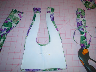 The backing, cut two pieces of the fabric, one is front, one is back. No Batting or interfacing, but you could if you wanted to. The white thing is my pattern cut from freezer wrap.