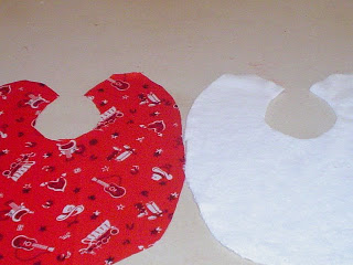 You can buy terry cloth ($5-$7 a yard), or you can go to the thrift store and buy a bathrobe. I found this high quality robe that looked like new for less than $3. I was able to make seven sets of bibs and burpies out of one robe. All the fabric was what I had on hand. :o)