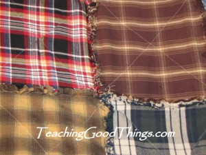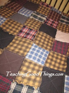 I used a bunch of old flannel shirts that I’ve been saving up and made this quilt. It may not be the prettiest, but I use it between the other quilts on our bed and it sure is warm! This would be great for a boy’s room too!