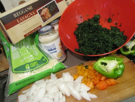 Layer cooked noodles, and then layers of cheese, peppers, onions, spinach, salt and pepper.