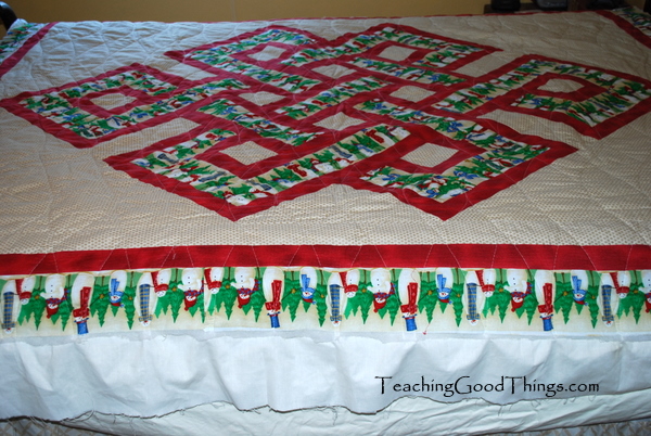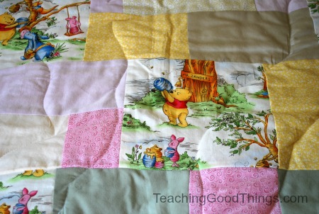 Cherish (11), made her new nephew a quilt. This was her first time to use a rotary cutter and quilting rulers. She also got a LOT of practice using the seam ripper. 😉 The quilt was much more difficult than her first one a couple years ago.