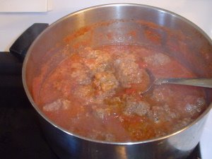 Do not stir until the outsides of the meatballs have cooked some, about 20 minutes, otherwise they may fall apart. Simmer for a couple hours. Skim off grease before serving.