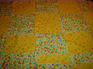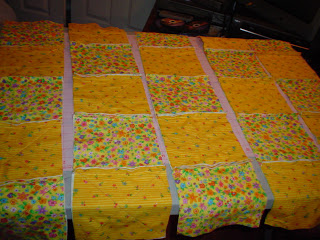 After all your X’s are sewn in (this is your actual quilting),you need to lay your squares out and see how you want to put them together.I chose to alternate squares to give this a patchwork look.