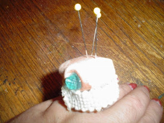 Save your coke caps, or if you live in the north you'd call them soda or pop caps! ;o) Wash and dry them. Heat a metal skewer over a candle flame and quickly stab and melt your way into the cap. You may need to work it back and forth a bit to make the holes wide enough. You can spray paint your caps before or after you put the holes in, though I think it is best to paint them before, but I forgot to take a picture! ;o) Use about 3" of 1/4" wide elastic. Here I cut 3/4" elastic down the middle and it has worked fine. I used a small crochet hook to help bring the elastic through the holes. Tie a knot on the inside of the bottle cap leaving enough 'loop' on the bottom side for you finger to fit comfortably. Cut a circle of fabric about 4" in diameter, and use a small amount of batting or wool (I used old wool sweaters form the thrift store, it will keep your needles from rusting), and place it in the middle of the fabric.